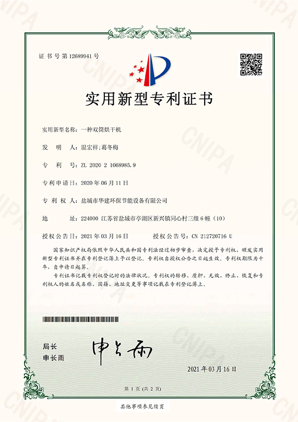 一種雙筒烘干機-實用新型專利證書